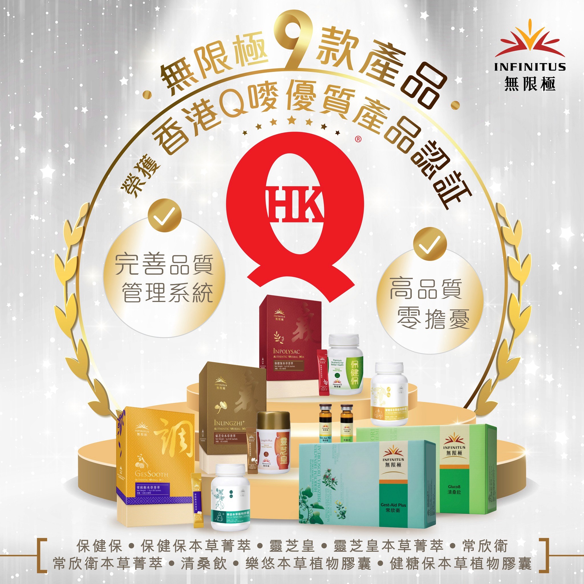 無限極「100-1=0」的質量管理原則,從原料採購到成品,整個過程對錯誤零容忍,以達到「高品質 零擔憂」的質量要求。是次共有9款產品(保健保、保健保本草菁萃、靈芝皇、靈芝皇本草菁萃、常欣衛、常欣衛本草菁萃、清桑飲、樂悠本草植物膠囊、健糖保本草植物膠囊)榮獲香港Q嘜優質產品認證。