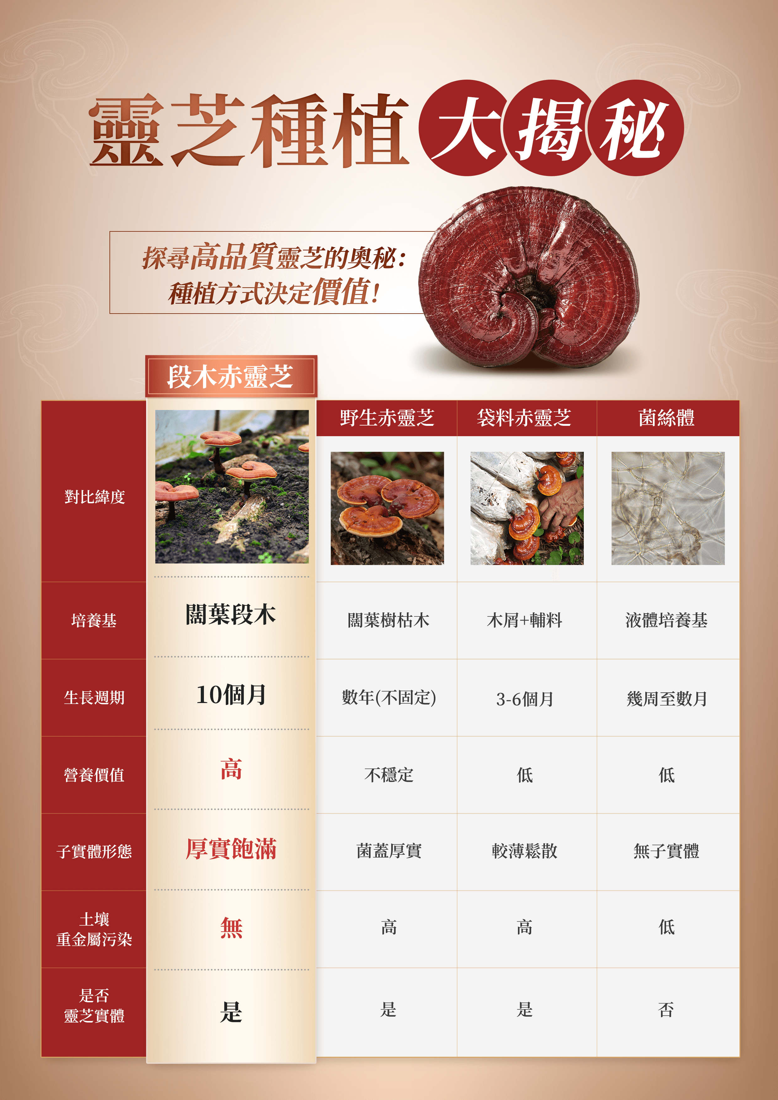 我們的赤靈芝採用了椴木種植方式,這種方式模擬了靈芝的野生生長環境。選用天然椴木作為培養基,靈芝的生長周期長,養分充足,令長出來的靈芝厚實飽滿,而且多醣及三萜含量也遠高於其他人工栽培方式。更重要的是,我們依據中國藥典的標準,嚴格控制靈芝的生長時間,確保其有效成分達到最佳含量後再進行採收,絕不使用已經產生孢子粉的靈芝,這樣才能保證最好的品質及營養。